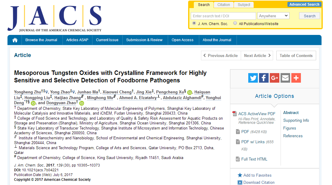 近日,美国化学会顶尖期刊《美国化学会志》在线发表304am永利集团与复旦大学合作的研究论文《Mesoporous Tungsten Oxides with Crystalline Framework for Highly Sensitive and Selective Detection of Foodborne Pathogens》(J. Am. Chem. Soc. 2017, 139, 10365−10373,IF=13.858)。304am永利集团朱永恒副教授和赵勇教授为论文的共同第一作者,复旦大学化学系邓勇辉教授为论文的通讯作者。该研究团队设计合成出一系列具有规整纳米孔道和高比表面积三氧化钨(WO3)半导体材料,并将其制作成气敏纳米器件,首次将该类半导体器件用于快速选择性地检测食源性致病菌。