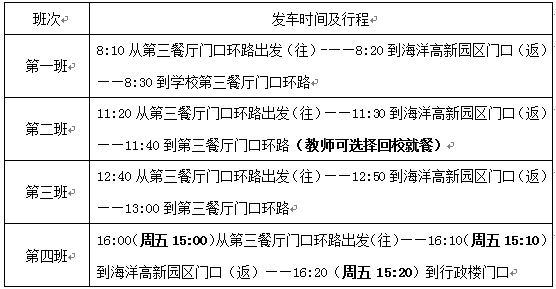 6月5日,公司开通校园至海洋高新园区的班车(见校园网6月1日相关通知),为公司五大实验平台师生在园区开展教学、科研工作提供了良好的后勤保障,得到大家欢迎。为进一步做好本项工作,现决定从9月6日(周三)始,在新学期继续开通本交通班车,具体安排通知如下。