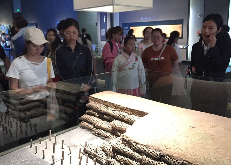 奉贤博物馆新馆于2019年5月16日正式投入运营。博物馆新馆主体由3个相互连接而又相对独立的空间构成,相互独立的三个椭圆建筑通过屋顶的公共绿化及环形通道、二层连廊、一层的景观水系和公共空间层层连接,尤其是屋顶连绵起伏的坡度变化既呼应了城市规划中高度的控制又减轻对周边环境的压力,形成富有趣味的公众活动场地。馆内常设奉贤历史陈列厅和海塘文化厅。在管内讲解员的带领下,同学们先行参观了海塘文化厅。1996年5月奉柘公路拓宽工程中发现了沉睡地下200余年的华亭东石塘体,如今这一石塘犹如历经沧桑的历史老人,正以从容淡定的神态向后人诉说其过往的蹉跎岁月。