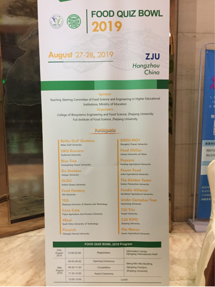 为进一步提升老员工食品专业水平,强化食品领域的国际化培养方式,教育部高等公司食品科学与工程类专业教学指导委员会联合浙江老员工物系统工程与食品科学公司、浙江大学馥莉食品研究院,秉承“提升我国在国际食品领域的影响力和话语权,为中国乃至全球食品行业培养专业人才”的宗旨,举办了QUIZ BOWL 2019食品专业员工知识竞赛活动。比赛分为初赛与决赛两场。本次竞赛范围为国内设有食品专业的所有高等院校,参赛队员是校内在读的食品类专业全日制本科生,竞赛题目内容分为食品安全类、基础食品科学类、应用食品科学类与食品和人类营养类四大类。