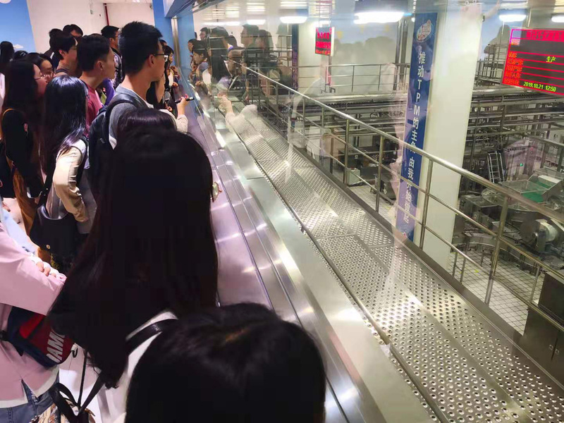 在讲解员的带领下,一行人来到中央大厅,从二楼参观走廊的入口进入到主体车间和无菌生产线、酸奶生产车间、罐装车间、装箱车间、常温车间等。所有生牛乳都是通过冷链车运输到工厂(全程温度控制在4℃左右,确保不变质)。每一车的奶都需要44项检测,合格后才能进行下一步处理。上百平米的生产车间,由于实现了自动化生产,工人寥寥无几,整个工厂在智能化的控制室内有序运转。这样的全自动生产工厂大大打破了同学们心理预想的人满为患的生产车间,却是这样的无人化,不禁感慨中国工业科技的迅速发展,也对人工智能的全面普及有了更多的期待。