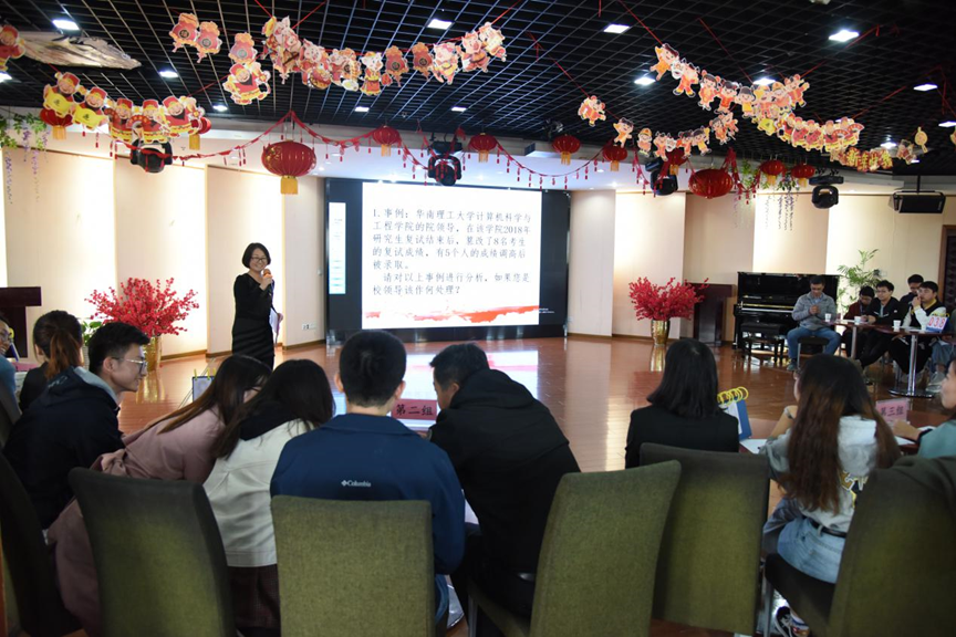 最后的案例分析题,各支队伍分别从全面从严治党、师德师风建设、维护教育公平公正、纠正四风等方面对案例做出了准确的分析,展现出学以致用的良好的学风。