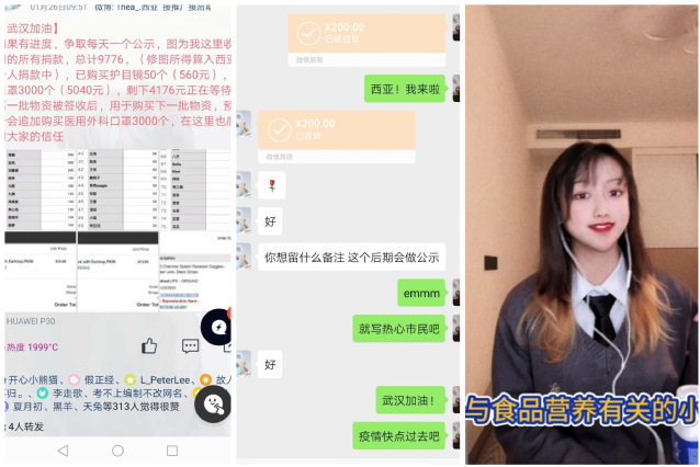 来自18级食安专业的郑新琦同学从新闻中了解到,很多医护人员常为了节省防护用品而整天不吃不喝奋斗在一线,物资的匮乏、资源的紧张也导致他们不能更好地战斗,原本计划捐钱的她几经周折,在互联网上和网友们一起筹款从国外采购口罩和护目镜。这些钱虽然是自己辛苦兼职赚来的,但因为武汉需要,国家需要,作为一名青年团员、员工骨干的她义无反顾的捐了出来,同时她还参加了线上学习的志愿讲解工作。她说,如果没有这些奋斗在一线的人,哪有我们的岁月静好,雷锋精神告诉我们要向上向善,我们要发扬“匹夫有责”的爱国精神,战疫面前无小我!