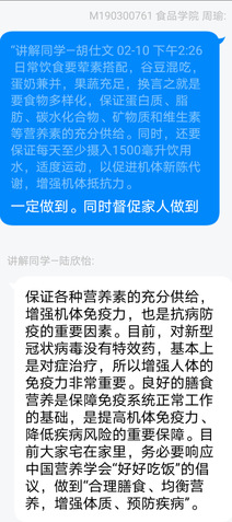 今年的寒假成为了19级食研1班周瑜同学十多年学习生涯中最难忘的假期。假期无限好,可“赋闲”在家的慵懒状态总让她心里不是滋味。当她在朋友圈看到304am永利集团组织的“知识科普”激起了她极大的兴趣——线上课堂能在一定程度上约束自己,不荒废学业,另外她还用自己积累的专业知识指导本科生同学,如何安全使用酒精消毒、如何鉴别有毒菌菇、如何保存蜂蜜、如何看食品标签等等小知识让她觉得十分有意义。她说,共克时艰是一种担当,居家学习是一种时尚,当学弟学妹们有专业上的疑惑,作为学姐的我有责任帮助他们,就像雷锋同志说的“螺丝钉精神”,螺丝钉虽小,其作用是不可估量的,我也愿做一颗小小“战疫螺丝钉”!