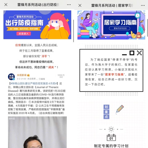 今年的三月是全民抗击疫情的关键时期,广大医务工作者为了护佑健康、挽救生命,舍小家,顾大家,迎险逆行,以实际行动诠释着“甘于奉献、大爱无疆”的雷锋精神。为了当好青春抗“疫”尖兵,作为院团委志愿者中心的同学们主动承担起疫情宣传工作,勇于担当作为,把防控作为责任,传承当代雷锋精神的新内涵。