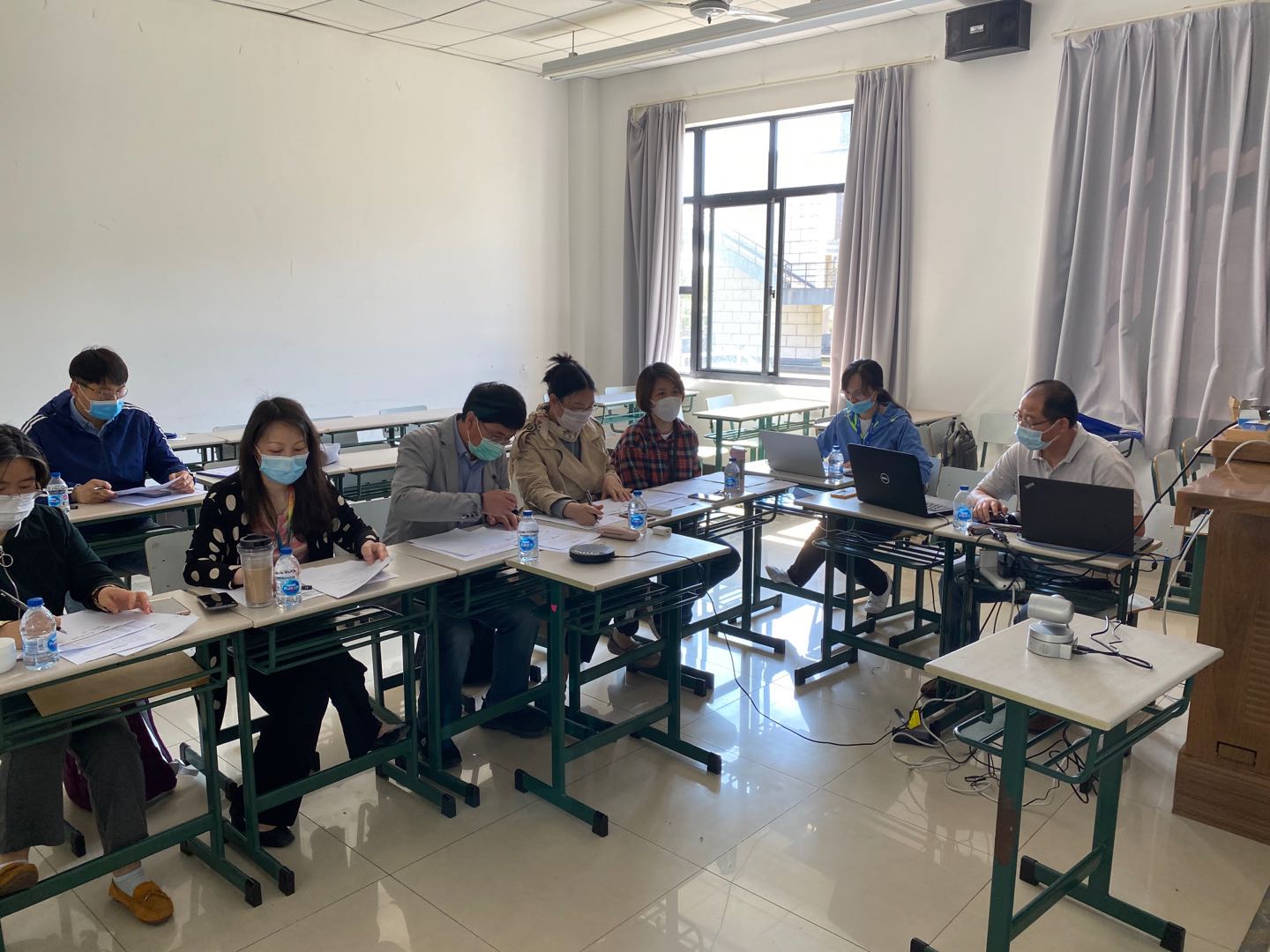 面对复试工作的新形势,公司教职工不畏困难,积极做好复试工作,共9组70余位教职工参与了此次复试工作,每个考场由5位导师考官、1名思政老师、1名复试操作人员兼答辩秘书和1名复试记录员组成。在做好复试工作的同时,积极做好防疫工作,通过复试前考场清洁并给每位老师配备防疫物资等多项举措确保复试工作的安全和顺利进行。同时,复试前,对操作员、记录员进行了专门的培训,提前完成设备调试工作,答辩秘书事先组织了面试英语和专业试题库,确保复试过程的顺利进行。