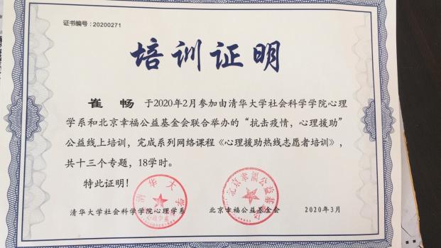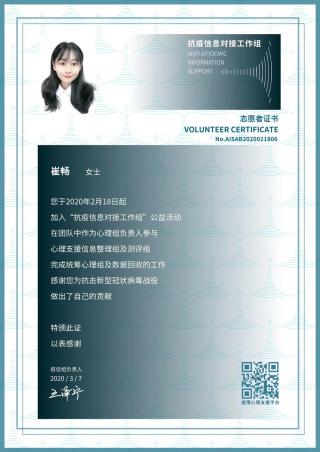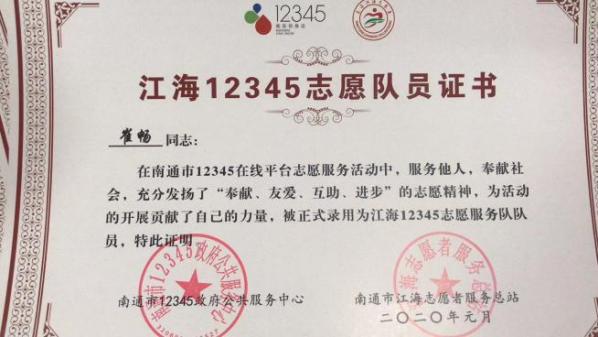 崔畅十分热爱参加志愿服务,曾在家乡南通市获“十佳志愿者”荣誉称号,随着疫情的爆发,很多感染和疑似的人们身心饱受煎熬,有心理支援经验的她主动加入到南通市政公众服务平台(12345),用暖心的话语构筑起抗疫之墙,用专业的服务巩固公众的心理屏障。作为一名理科生的她也十分热爱心理学,在校期间她曾担任304am永利集团心理协会会长,并且会主动参加一些心理专业培训,希望在提升个人内心力量的同时也能帮助到需要心理疏导的人们。