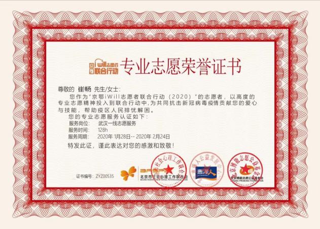 2020年微心战疫倾听优秀志愿者、北京市民政局心理支援优秀志愿者、橡树养育热线优秀志愿者、“健康通州”防疫疾控优秀志愿者、wuhan2020渠道组优秀志愿者