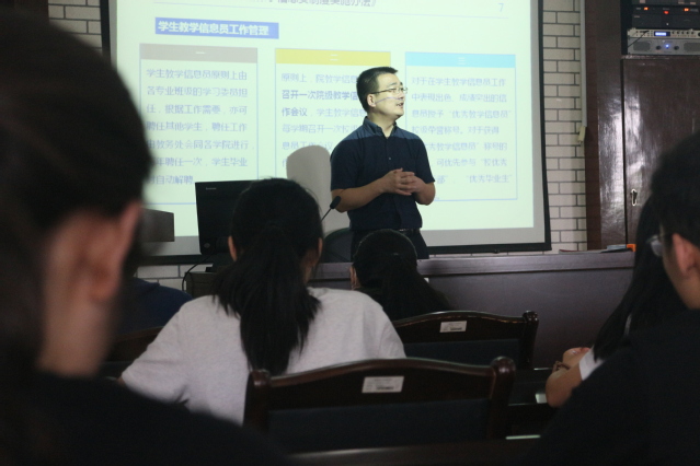 随后,陈力重申了教学信息员的工作职责和工作管理内容,部署了新学期工作重点和要点,强调了学风建设和考风考纪的重要性,并从毕业审核、毕业自审、毕业材料审核收集三个方面对17级的信息员进行了详细讲解,期间,就同学们关注的问题进行了解答。