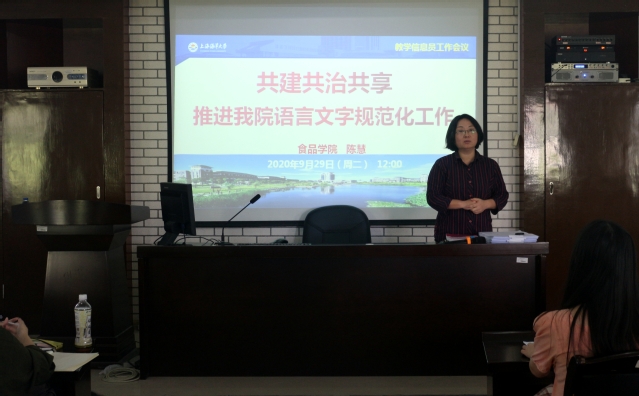 陈慧首先以语言文字工作的重要意义为切入点,强调语言文字规范化是依法管理的需要、是高校的文化传承和创新的使命,指出“语言文字工作不是中心、服务中心,不是全局、影响全局;语言文字规范化与师生息息相关,说说容易、做做难,贵在平时”的工作特定,要求大家在熟悉《上海普通高等公司语言文字工作评估标准》的基础上,深刻领会“三纳入已渗透”的精髓,自觉使用规范化语言文字,说普通话、写规范字;自觉按要求参加普通话水平测试;自觉参与语言文字环境的整治与监督。接着,她介绍了本次啄木鸟行动方案,明确了工作要求,最后,她与同学们分享了一些语言文字规范小贴士,要求大家从我做起从现在做起,共建共治共享、推进公司语言文字规范化工作,进一步优化育人环境。