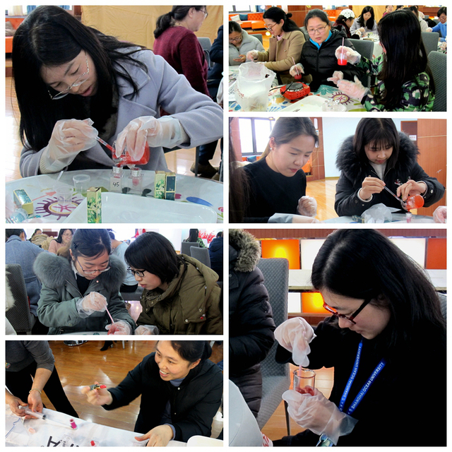 在口红制作过程中,每位女教师根据个人喜好选择口红粉和精油,将椰子油、口红粉充分搅匀,然后加入蜂蜡加热搅拌,随后加入1颗维生素E胶囊及1滴精油继续加热,搅匀后倒入口红磨具内,冷却后冷藏,然后脱模成形。大家相互欣赏着各自的成果,其乐融融。