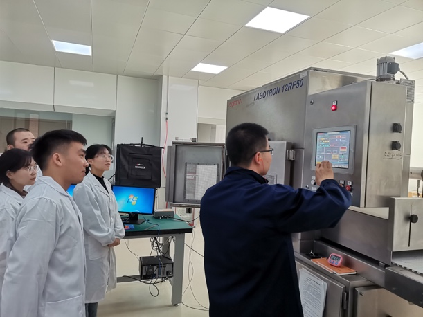 此间,热加工中心的李锋老师也在培训会上针对射频加热器的基本工作原理、操作规程及使用中的关键点对研究生进行培训,主要为研究生运行射频加热这一新技术开展学术、工程研究提供指导。SAIREN射频加热器是运用频率为27.12MHz的电磁波作用于物料,物料中的极性分子和带电粒子翻转振动产生热量从而使物料温度升高,实现解冻、加热、灭菌等加工目的。射频加热器在使用中需要调节加热极板间距和工作功率等一系列参数实现最优阻抗匹配,此外,还需要运用红外热像仪和光纤温度传感器等采集物料表面和物料内部的温度,从而确保实现食品的高效、均匀加热。