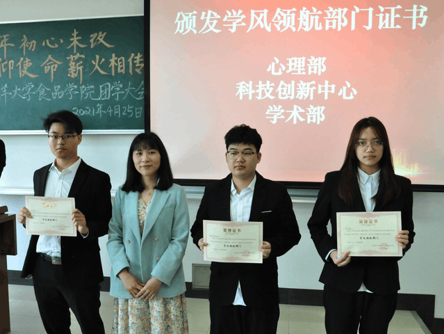 孙书记的致辞让全体团学骨干激情澎湃,充满砥砺奋斗的信心与底气,坚定奋进的信念。接下来茜丽尔、岳铭、郝洁、刘源和孙红刚分别颁发团学优秀干事、学风领航部门和思想领航部门荣誉。
