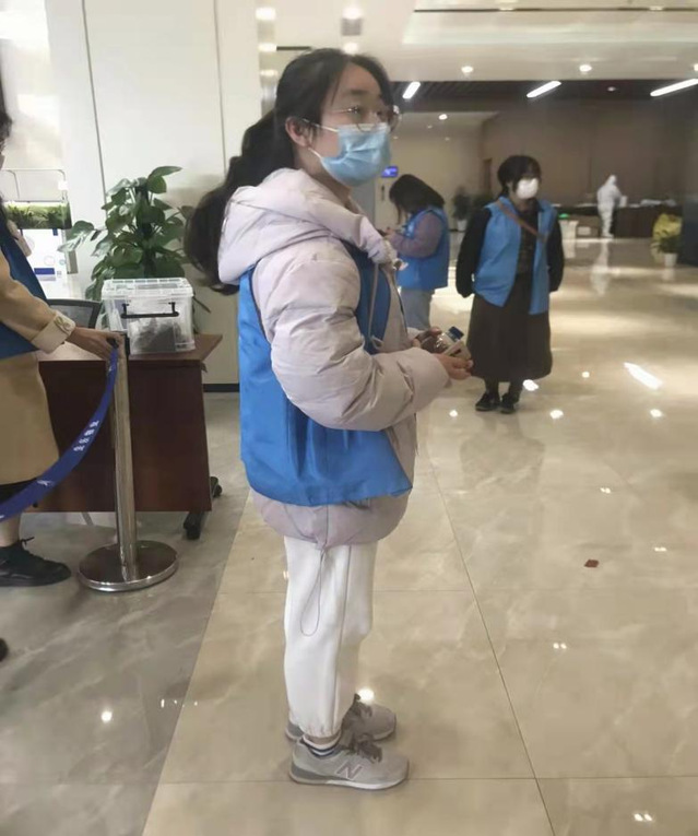 在核酸检测过程中,为快速检测,郑未同志主动帮助医护人员撕开棉签,在人多的时候帮助控制排队人数和排队间隔,在检测中提醒同学们提前打开试剂瓶。郑未说:“作为一名志愿者,真正体会到医护工作人员的辛苦,也希望疫情早点结束,共迎如初的上海。”