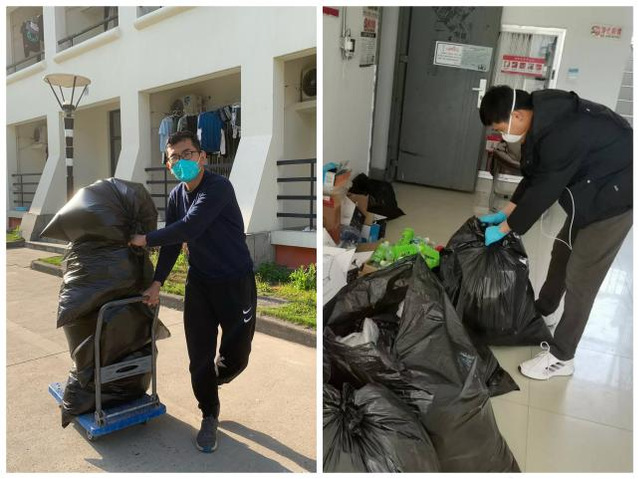各楼层在整理宿舍垃圾后,依次将其运送至一楼门厅,临时党支部副书记李杰和党小组组长刘源两位老师对各类垃圾进行检查、打包后运送至垃圾清运通道,由小区消杀负责人罗阿姨进行消杀后转运出小区,在各项环节上确保落实疫情防控要求,科学防疫,守护师生健康。