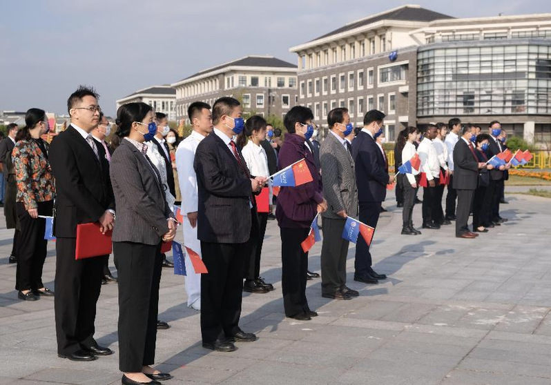 迎着临港新片区初升的朝阳,在全体师生的注目礼下,英姿飒爽的仪仗队成员踏步走来,将国旗护送至旗台。伴着《义勇军进行曲》,五星红旗冉冉升起,迎风飘扬。