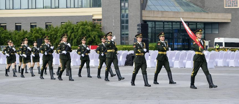 (仪仗队成员昂首阔步走向旗台)