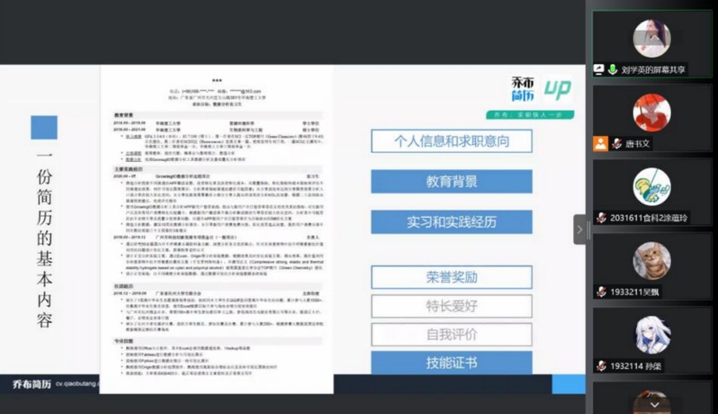 受到疫情的影响,毕业生就业压力增加,为了增加就业的同学的竞争力,304am永利集团邓高燕老师邀请了刘学英老师于2022年11月9日18:00开展简历指导会。会中刘老师详细讲解了简历中的个人信息、求职意向、教育背景、实习和实践经历等内容该如何去撰写,有什么注意事项,也列举了生动形象的例子,方便同学们理解与学习。最后刘老师为同学们在线进行简历的修改并为同学们提出有用的建议。
