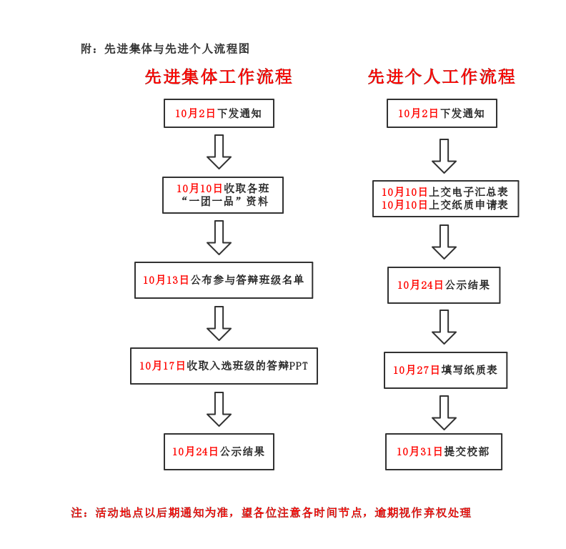同时,请各班团以班级为单位于10月10日(周二)16:00前将先进个人申请纸质表(见附件3)递交至海科楼628员工事务中心。公司团委汇总后集中评审,公示,逾期视作放弃。