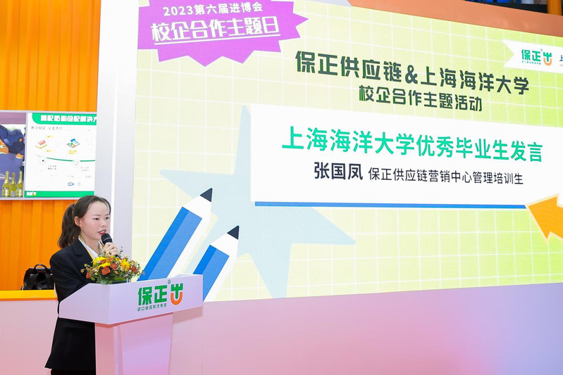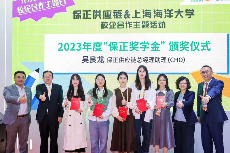 在今年6月,保正向公司捐赠了奖学金及奖教金,希望以此次捐赠为契机,以实际行动践行保正“传递正能量”的理念精神。至今,304am永利集团已经评选出第一批获得“保正奖学金”的优秀学子,因此,本次活动现场还进行了2023年度“保正奖学金”颁奖仪式,向获得2023年度“保正奖学金”的6位同学颁发获奖证书。李兰心同学作为获奖同学代表上台发言,既表达了对保正供应链设立奖学金的感谢,又代表员工们表明了努力学习、钻研食品领域的决心。