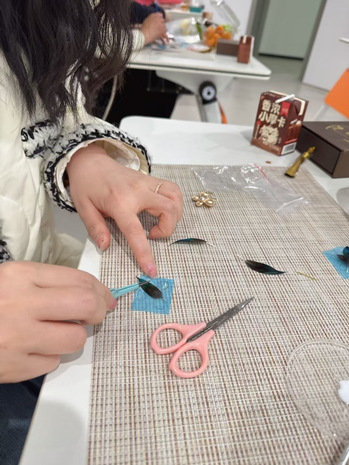 为了让大家更深入感受点翠工艺的魅力,活动特别设置了体验环节。女性们围坐在一起,在专业老师的指导下,小心翼翼地拿起工具,尝试进行点翠工艺的简单操作。尽管只是模拟体验,用的并非真正翠羽而是替代品,但大家的专注与热情丝毫不减。有的在金属片上仔细涂抹胶水,有的专注于摆放羽毛的位置,力求呈现出最美的效果。在这过程中,大家相互交流、互相帮助,现场气氛热烈而温馨。一位参与者兴奋地说:“以前只在电视上看到过点翠饰品,觉得遥不可及。今天自己动手体验,才知道其中的门道这么多,真的太有趣了,感觉自己与传统文化有了一次亲密接触。”通过亲身体验,女性们不仅领略到点翠工艺的魅力,更在指尖流淌的过程中,对传统文化的传承有了一份更深的使命感。